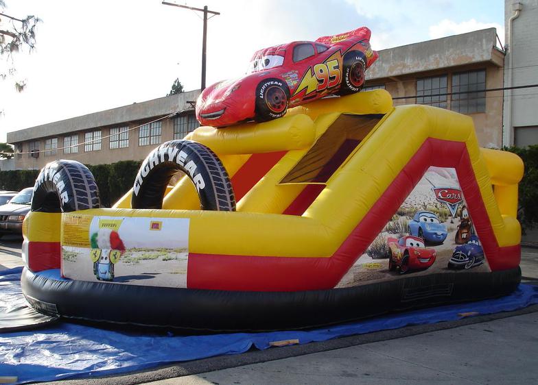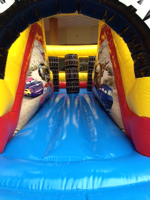 The Cars Speedway has a large interior jumping area and pop-up obstacles. It also has 2 seperate climb and slide areas.