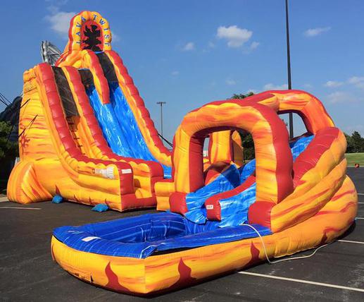 Our 27ft Lava Twist with Pool will surely blow you out of Water! Riders come zooming down the water slide into a 90 degree turn which features a banked wall and finally landing into a pool!