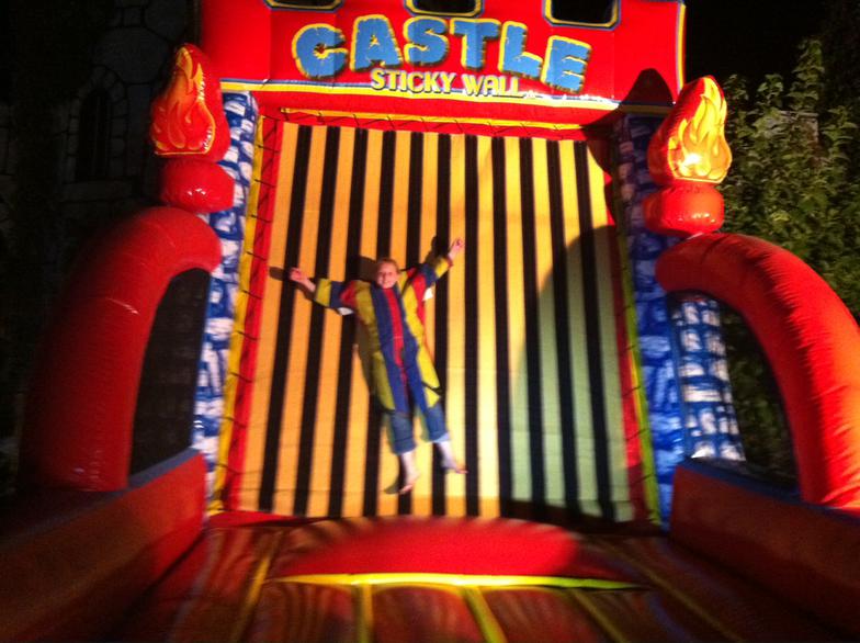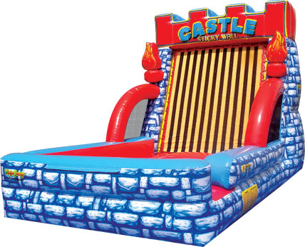 The Castle Sticky Wall takes normal Sticky Walls to royal heights! Guests step into a sticky suit, and then take their turn at storming the castle. Once they reach the end, the oversized inflatable Velcro wall catches participants in mid-jump. This one-of-a-kind inflatable attraction features brick artwork, battlement detailing at the top of the unit, along with three-dimensional torches flanking the sides. This amazing 15-foot inflatable attraction is sure to capture the attention of guests young and old!