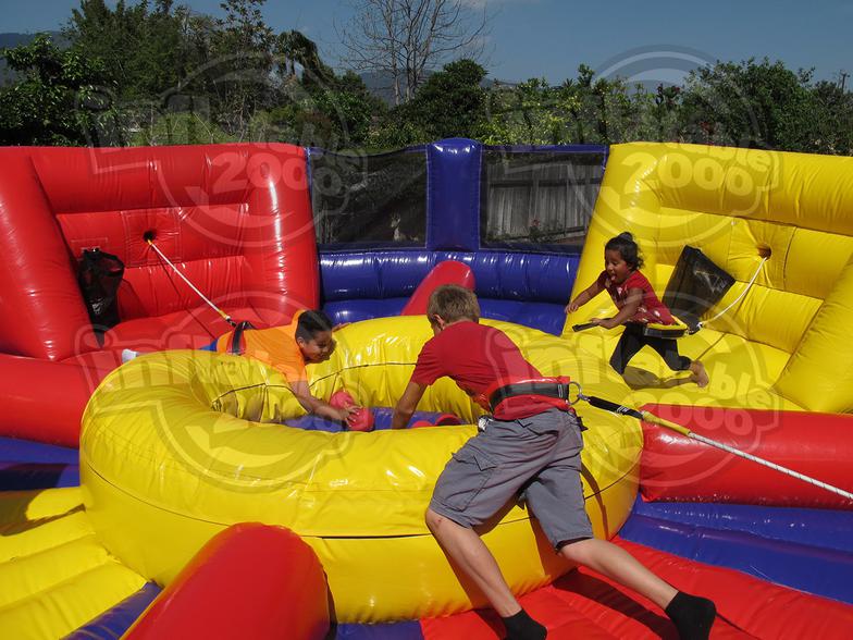 This is the latest 4-player bungee tug-o-war style game that involves speed, strength and agility. Object of the game: Once the referee blows the whistle, each of the 4 players starts from their back wall and races to the pond of balls in the center of the game to retrieve as many balls as possible and return them to the mesh bag at their starting wall. Once all of the balls are chow’d down, the player with the most balls in their bag is the winner.
