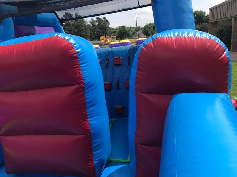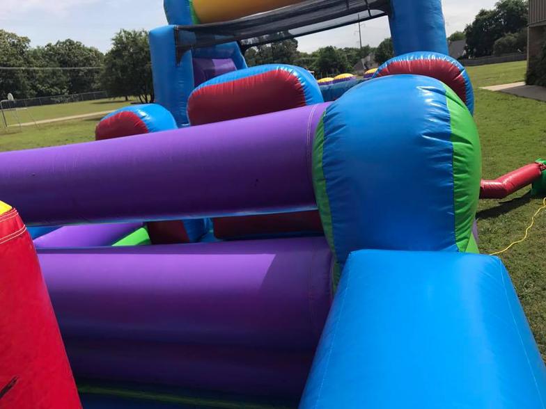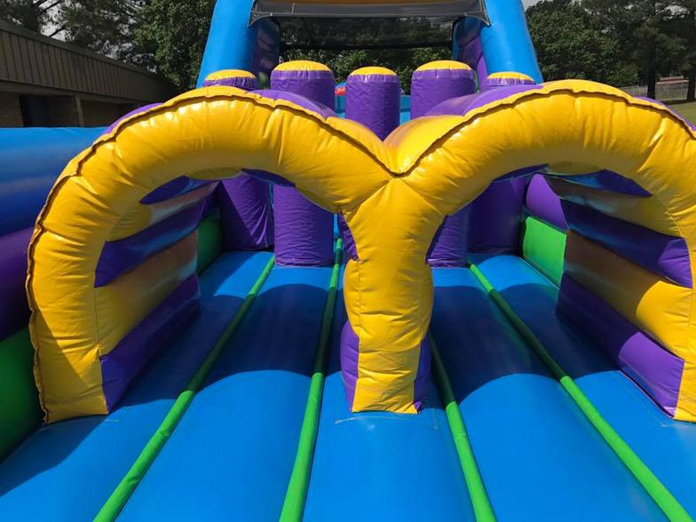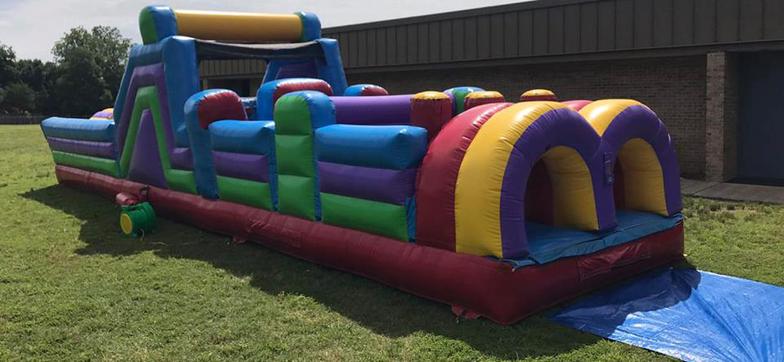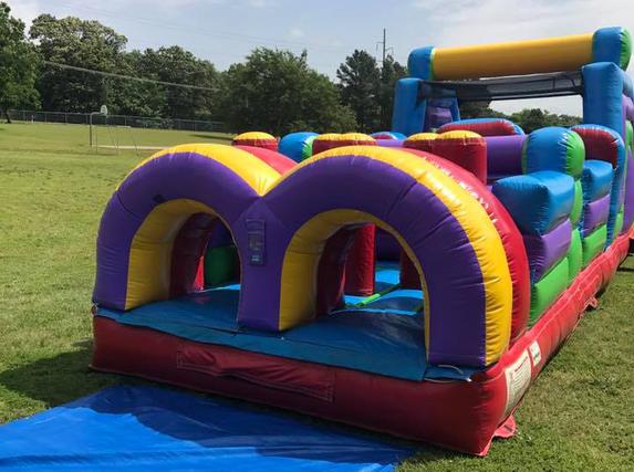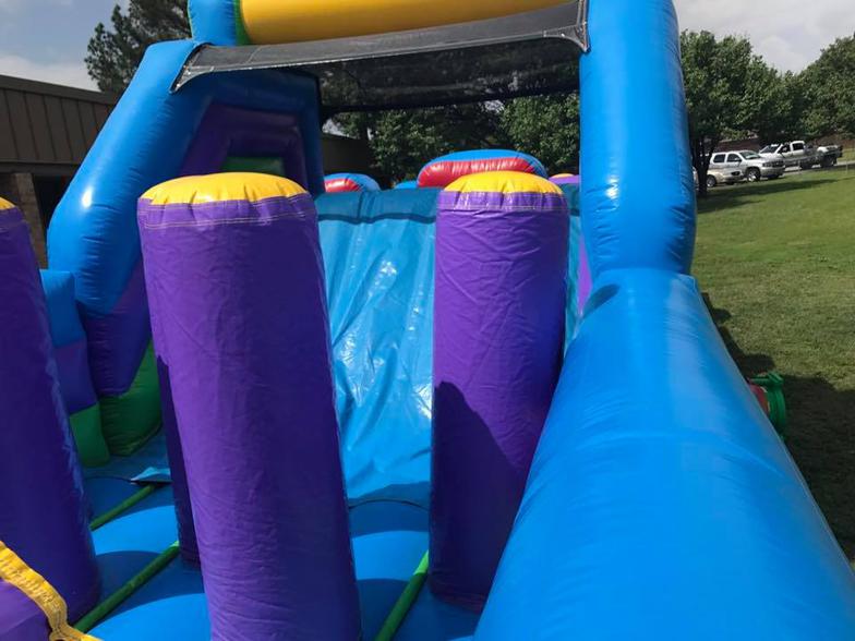 The Inflatable 40ft Obstacle Course is an oversized inflatable play structure which has a bright and colorful theme of yellow, red and blue, perfect for high-traffic days. The 40ft Course is set up for friendly competition play, with dual entrances and exits. Challenge your friends thru the tunnels, pop ups, & slide. Great for all ages!