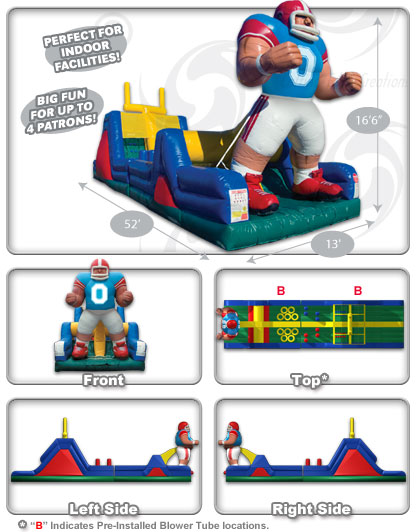 Challenge the 52' of squeeze plays, tackle dummies, tire runs and a final climb ending with a giant slide on this obstacle course. The experience will remind you of your football glory years.​​