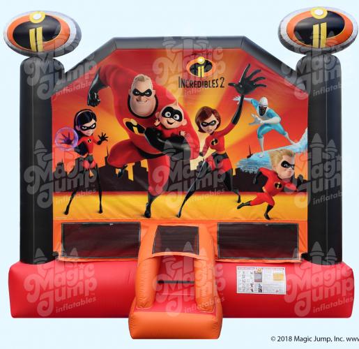 Join everyone’s favorite family of super heroes with the Official INCREDIBLES 2 15' x 15' bounce house rental. It has plenty of space for kids to bounce, hop, skip, and jump to save the day. The INCREDIBLES 2 bounce house rental is designed with fully licensed digital artwork and the logo from their superhero outfits as embellishments on top of both front vertical pillars. It is an incredible ride that is suitable for all occasions.