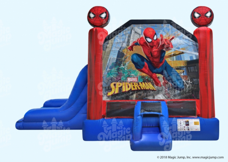 Courtesy of your friendly neighborhood web slinger comes the Official SPIDER-MAN Bounce House Combo Rental. Let friendly neighborhood friends bounce, play basketball, or climb and slide. The SPIDER-MAN combo is designed with fully licensed digital artwork and the logo from Spidey’s uniform as embellishments on top of both front vertical pillars. It is a spectacular & amazing ride that is suitable for all occasions.