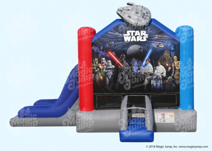 Coming from a galaxy far, far away is the Official STAR WARS Bounce House Combo Rental. Let Jedi Knights bounce, play basketball, or climb and slide. The STAR WARS bounce house combo rental is designed with fully licensed digital artwork and a unique Millennium Falcon embellishment up top. It is an epic ride that is suitable for all occasions.