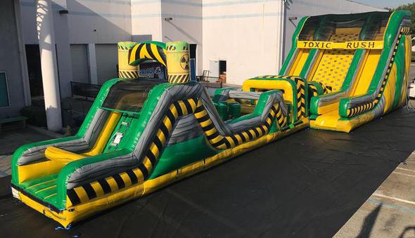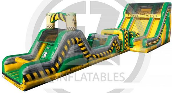 What do you get when you combine our 40ft Toxic Obstacle Course with the Toxic Rush? You get the Insane Obstacle Course! 70ft long and 22ft tall you will be tired after you race your opponent thru tunnels, pop ups, crawl thrus, & finally up the large rock climbing wall and down the slides!